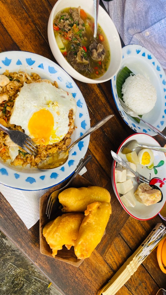 Nasi Goreng= Stir fried rice, meats and vegetables, with a fried egg.